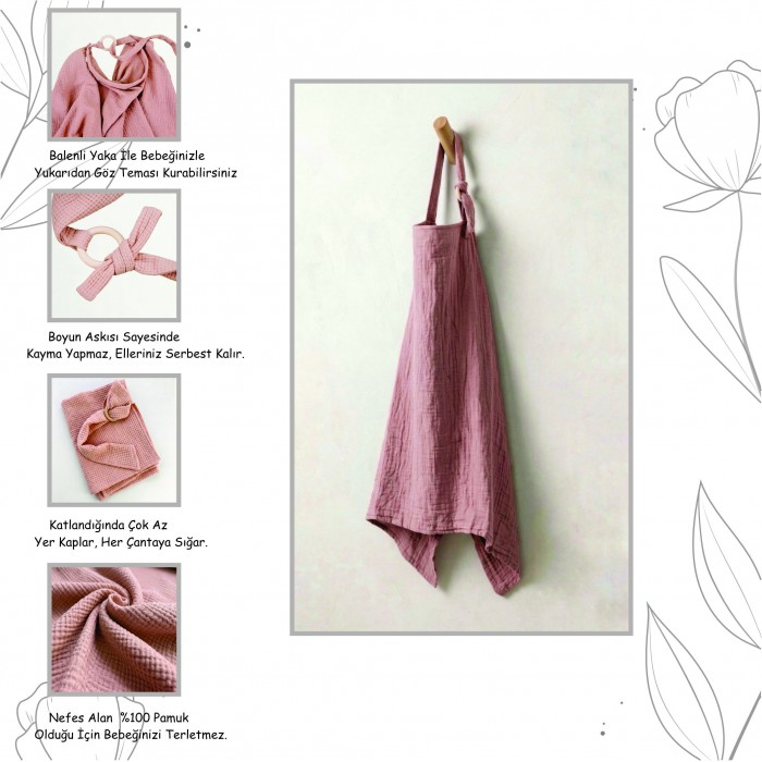 Emzirme önlüğü sadece emzirme sırasında değil; aynı zamanda bebek arabasında güneşlik, omuz örtüsü veya bebeği uyuturken hafif bir örtü olarak da kullanılabilir.